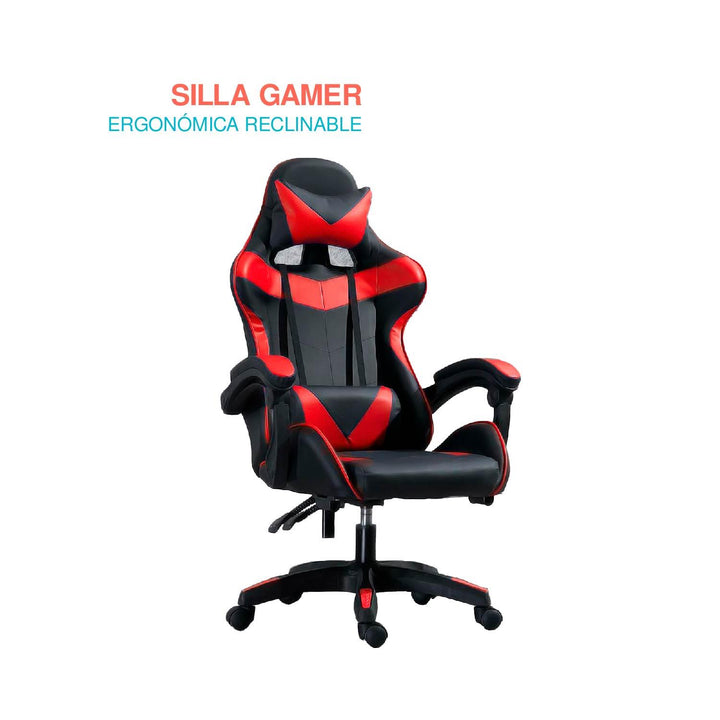 Fantástica silla profesional para videojuegos que le brindará una experiencia de comodidad por largas horas, incluso se puede utilizar para trabajar, ver tv o descansar. El asiento está tapizado en PVC sintético resistente al desgaste y relleno con espuma de alta calidad, es ergonómico, por lo que no sufrirá de dolores de espalda o fatiga, además posee reposacabeza con cojín y soporte lumbar extraíble para que pueda descansar durante sus actividades. Estructura de metal.