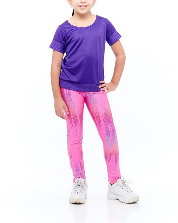 Pantalón de licra en color rosa con brillos de colores, blusa en color morado. En las mangas y cadera lleva un detalle en malla en color morado.